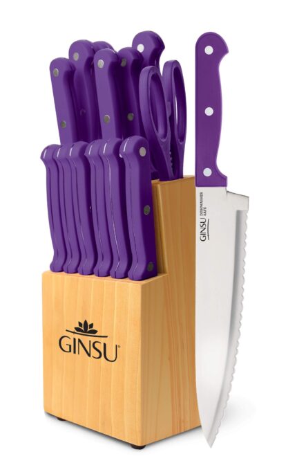 Ginsu Kiso 14-Piece Purple Knife Set with Black Block – Dishwasher Safe and Always Sharp