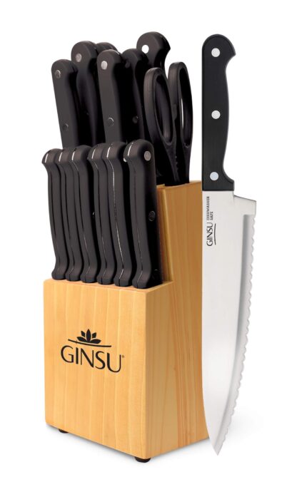 Ginsu Kiso 14-Piece Black Knife Set with Natural Block – Dishwasher Safe and Always Sharp